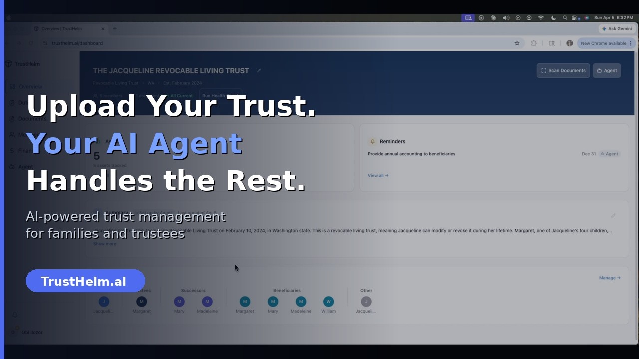 Upload your trust document and let our agent set everything up. It takes about five minutes.